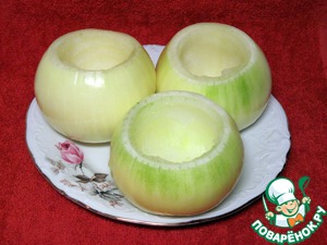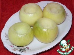 Аккуратно вынуть внутренную часть у лука при помощи ножа и ложки, оставив стенки толщиной 1 см.