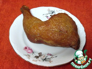 С копченого окорочка снять кожицу, отделить мясо и нарезать кубиками.