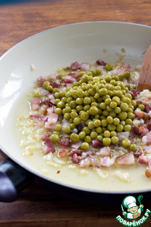 Ставим огонь на минимум, добавляем горошек и, деликатно помешивая, готовим еще минут 5.