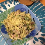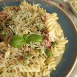 К этому времени уже сварилась паста, откидываем ее на дуршлаг и добавляем к соусу. Прогреваем все вместе, осторожно помешивая, еще пару минут, посыпаем пармезаном и раскладываем по тарелкам.