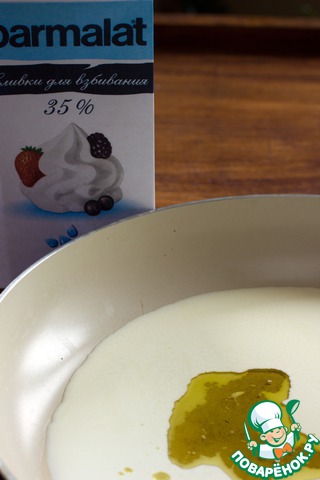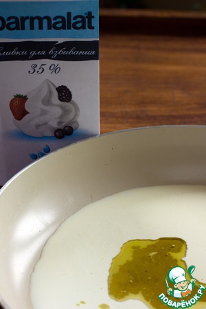 Сковороду поставьте на огонь и влейте сливки, добавьте масло.
