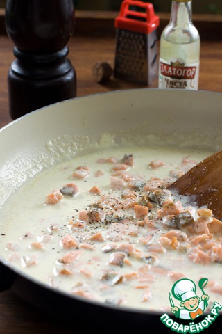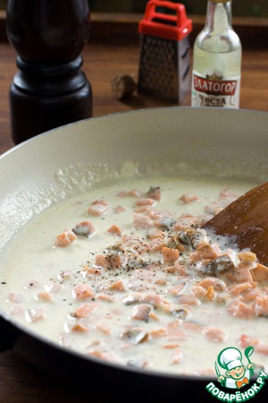 Как только сливки закипят, добавьте лосось, поперчите, всыпьте щепоть мускатного ореха. Солить не надо, рыба достаточно соленая. Влейте водку. Дайте соусу покипеть 2-3 минуты и снимите сковороду с огня.