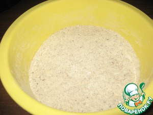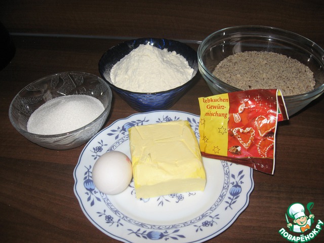Муку, перемолотые лесные орехи, приправа для Лебкухен и сахар смешиваем. (Муку желательно просеять).