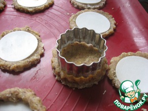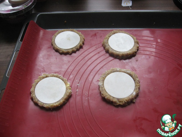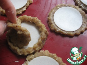Снова из оставшегося теста вырезаем 15 кружочков 7 см диаметром, кладем на каждый кружочек с пластинкой сверху еще один кружочек. И с помощью формочки диаметром в пять сантиметров в верхнем кружочке вырезаем серединку и убираем излишки теста так, чтобы получились маленькие "колодцы".