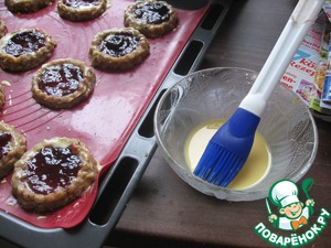 Ягодное желе хорошо размешать. У меня было неправильное желе :-D Точнее, у меня был конфитюр, и начинка покрылась пленочкой при выпечке. Поэтому возьму в следующий раз обязательно желе. Итак, добавляем в каждый наш "колодец" примерно по столовой ложке желе. Затем чуть взбиваем желток со сливками в мисочке и смазываем кисточкой этим печенья. Затем посыпаем декорированным сахаром для красоты (конечно, можно и не посыпать).