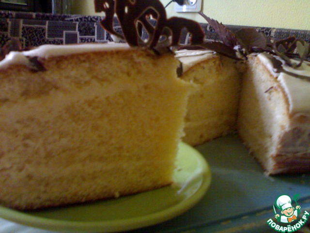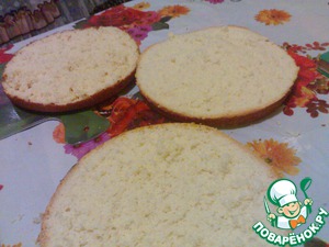 В смазанную форму вылить тесто и выпекать при 190 градусах около 35 мин. (Чем меньше форма, тем пышнее будет). Корж разрезать на три части. (У меня бисквит 9 см).