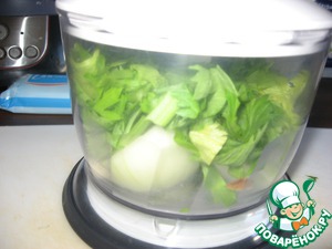 Размолоть в миксере чеснок, лук и зелень сельдерея.