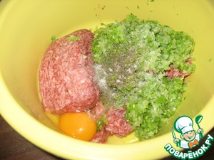 Добавить к фаршу зелень с луком и чесноком, яйцо, посолить и поперчить.