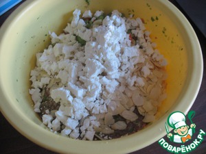 Вмешать в фарш 3/4 части от сельдерея с перцем и козьего сыра.