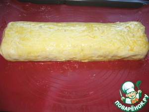 Раскатать прямоугольник из теста 60 на 36 см. Посыпать его панировочной мукой (я совсем забыла это сделать, каюсь).