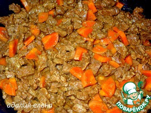 Говядину (у меня телятина) порезать на маленькие кусочки и потушить с луком, морковкой и томатом. Тушить около 1часа.