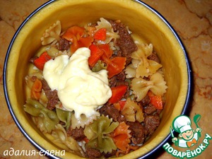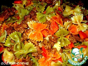 За это время отварить пасту (у меня фарфалле триколор) и добавить к тушеному мясу. Перемешать и убрать с огня.