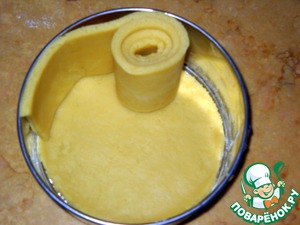 Подготовить форму для выпечки диаметром 18см. Вырезать круг из теста по форме и положить его на дно. Далее раскатать и вырезать борт по высоте формы. Края соединить.