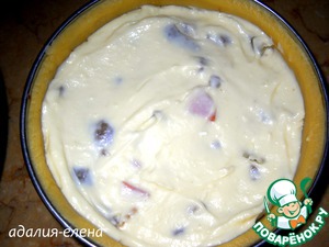Готовый пирог вынуть из духовки и дать ему остыть. Снять кольцо. Положить на тарелку и накрыть крышкой. Пирог можно сделать за день и затем пред подачей подогреть в духовке. Мне на следующий день пирог показался вкусней.