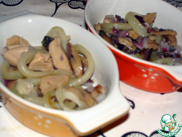 В формы или горшочки для запекания выкладываем обжаренную смесь лука, грибов и кальмаров.