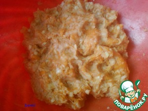 Смешиваем фарш, тыкву и лук. Посолить, поперчить по вкусу. Хорошенько перемешать.