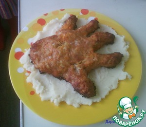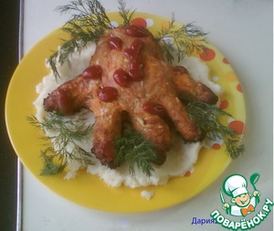 Пюре выложить на блюдо и разровнять, сделать как бы подушку и положить на пюре готовую запеченную руку.