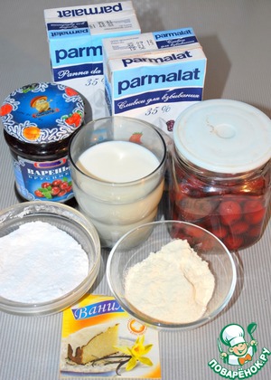 Вот наши ингредиенты (за исключением желтков). Прежде всего нужно заранее купить сливки, чтобы они постояли в холодильнике не меньше суток. Также нужно заранее залить коньяком вишню. Если предполагается, что десерт готовится для детей, замените коньяк на вишнёвый компот.