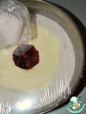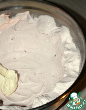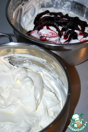 Круглую гладкую миску (вынимать удобнее) заполнить слоем розовых сливок и распределить их по стенкам. В середину выкладываем сливки с кремом.