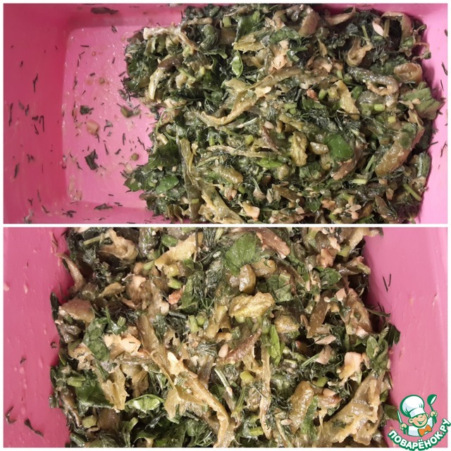 2. Пока огурцы готовятся, делаем заправку. Режем свежую зелень и чеснок. Смешиваем заправку с 3 ч. л. соевого соуса.