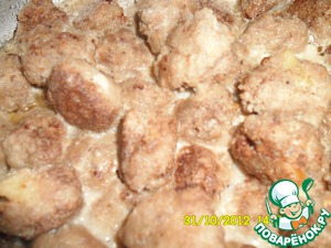 Для соуса муку обжарить на сковороде без масла до золотистого цвета. Отдельно соединить бульон и сливки. Осторожно ввести в муку. Посолить. Уварить до состояния густых сливок. Добавить майоран на кончике ножа. Выложить в соус тефтельки и прогреть.