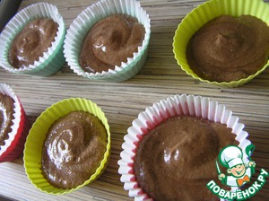 Выложить полученную смесь в формочки для маффинов (можно еще вставить бумажные формочки) или огнеупорные чашки смазанные маслом и слегка присыпанные мукой. ***У меня получилось 12 мини-десертов.