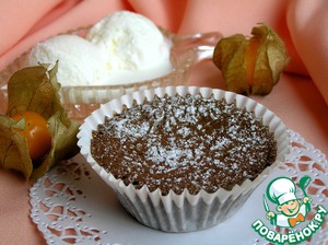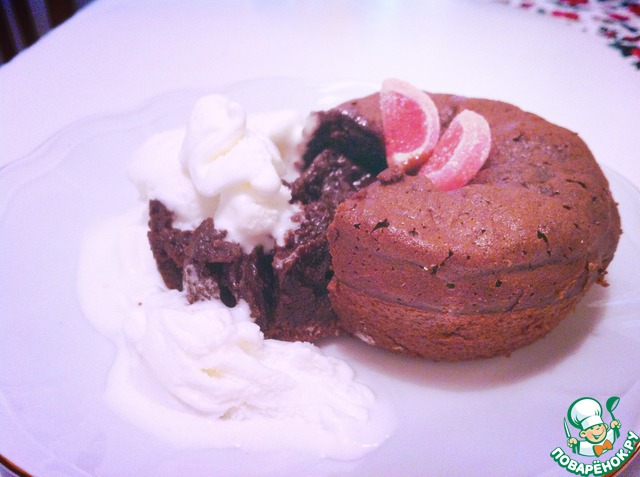 Выпекать при 180*С 9 минут. ***Когда вынете из духовки, серединка должна еще дрожать. Не передержите!*** Готовый десерт аккуратно вынуть из формочек, присыпать сахарной пудрой и подать с шариком мороженого.