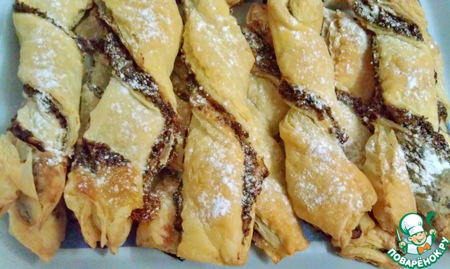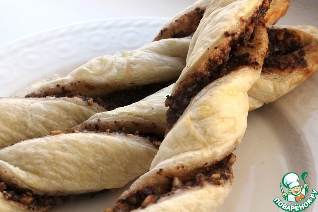 Слоёное тесто положить на пекарскую бумагу и половину намазать ореховой массой (у меня были кусочки слоёного теста, я просто брала один пласт, намазывала ореховой смесью, а второй, одинаковый по величине - абрикосовым конфитюром и потом накрывала один пласт другим).