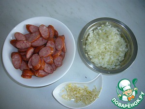 Мелко нарезаем лук (как-то я не рационально сгруппировала продукты при фотографировании, уж простите за словесные повторы), чеснок мелко рубим, колбаски -тонкими кружочками.