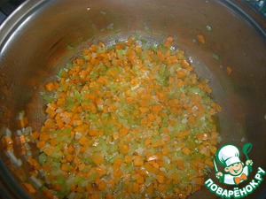 Обжариваем в кастрюле мороковь, лук, сельдерей и чеснок до золотистого цвета.