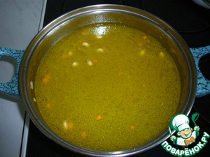 Заливаем бульоном (я пользовалась замороженными кубиками), добавляем бобовую смесь, нарезанный небольшими кубиками картофель, доводим до кипения и варим 30 минут.