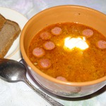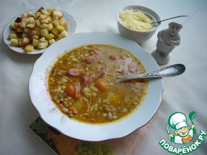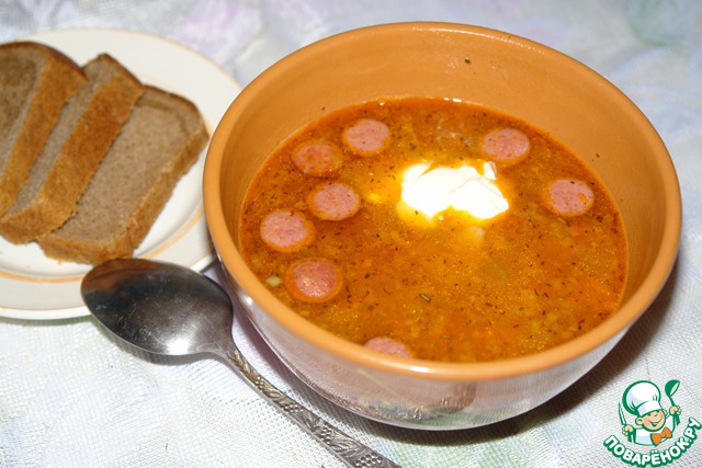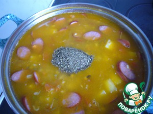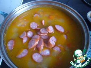 Добавляем нарезанные копченые колбаски и варим еще минут 10.
