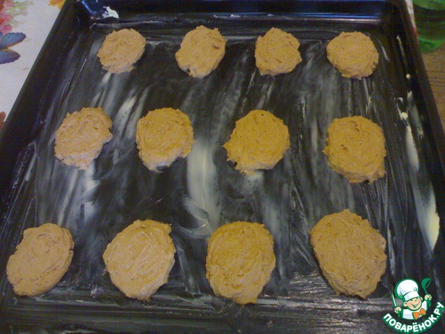 Противень смазать маслом или маргарином, ложечкой выложить тесто (печенюшки).