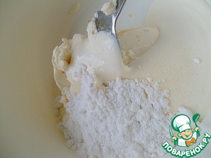 Приступаем к крему. Маскарпоне, сливки (500 гр) и сахарную пудру осторожно перемешиваем до однородности.