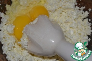 3. Тем временем займёмся приготовлением начинки. Творог смешиваем с яйцами, добавляем сахар. Хорошо перетираем.