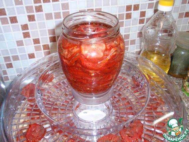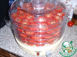 Нарезать помидорки колечками толщиной 5-7 мм, разложить на полочки сушилки для овощей, посолить, поперчить и поставить сушиться на 3-5 часов