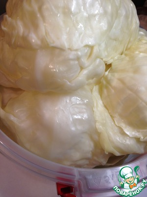 По истечении 20 минут достаем капусту (осторожно, горячая) и кладем ее в мойку, под холодную проточную воду. Подробнее процесс описан: http://www.povarenok .ru/blog/show/24529/