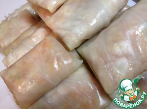 Сворачиваем голубцы. Занятие это удобное, потому как после обработки в микроволновке листья капусты по консистенции, плотности - как силикон.