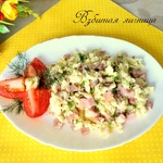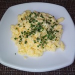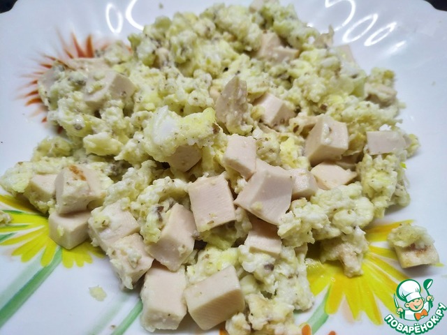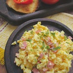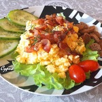 Такую яичницу можно подать с овощами, а также с мясными продуктами, например с вареной ветчиной. копченой грудинкой, сосисками. Эти продукты нарезают мелкими кубиками, слегка поджаривают на сковороде с маслом, затем смешивают с яичницей. Такие продукты, как жареные грибы в сметане, жареные дольки свежих помидоров, вареные зеленые бобы, зеленый горошек, заправленный маслом, обычно кладут на яичницу сверху, когда она уже готова.