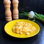 Когда яичница превратится в жидкую кашу, снять ее с огня и некоторое время помешивать, затем выложить яичницу на тарелку или в чашку, обложить гренками из белого хлеба, поджаренными на масле.