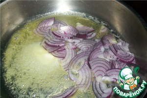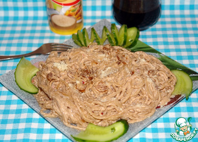 Спагетти сварить в соответствии с инструкцией на упаковке. Пока спагетти варятся, займемся приготовлением соуса. Распустить сливочное масло на сковородке и слегка потушить в нем нарезанную луковичку минуты две. Следите только, чтобы огонь был не большой и масло не почернело.