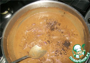 Как соус загустеет, пробуем на вкус и добавляем, если надо, по щепотке черного перца, соли и сахара.