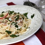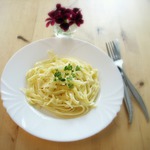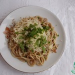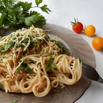 [+5]Небольшие изменения: вместо спагетти - гребешки, сыр - пекорино романо, зелень - кинза.