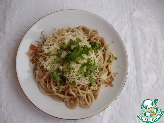 Со спагетти слить воду (сохранив одну чашку на всякий случай), положить спагетти к соусу и перемешать, если блюдо покажется слишком густым, то добавить жидкости из чашки. Разложить по тарелкам, сверху посыпать петрушкой и тертым пармезаном, сбрызнуть оливковым маслом. Немедленно подать на стол. Есть надо горячими, с пылу-с жару.