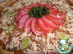 И дальше все слои повторить. Сверху украсить помидорами, луком пореем, петрушкой и посыпать сыром. Но здесь уже, кому как угодно.