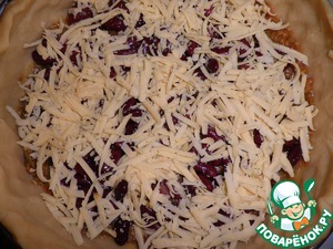 Готовим икру из баклажанов. У каждой хозяйки есть свой фирменный рецепт, у меня самый простой: измельчить баклажаны, лук, перец, морковь, чеснок, можно добавить зелень и обжарить все до однородной массы на растительном масле. Потом охлаждаем икру и выкладываем первым слоем в форму с тестом.
