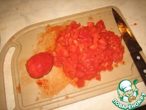 Готовим соус. Помидоры надрезать крест-накрест, ошпарить кипятком, снять кожицу, мелко нарезать.