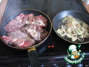 На одну сковородку - масло подсолнечное, мелко порезанный чеснок, когда начнет золотиться, туда лук из маринада, должен лук стать золотым.