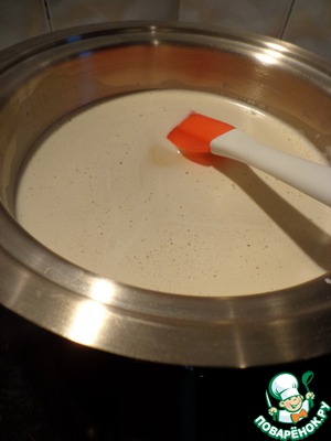 Поставить крем на водяную баню и варить, постоянно помешивая, до загустения. У меня водяной баней послужила кастрюлька, в которой варились каштаны. Таким образом, всё готовится одновременно.