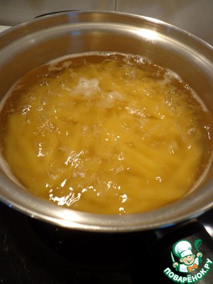 В кипящую подсоленную воду опустить макароны, варить минут 8.